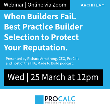 This CPD webinar introduces a structured, best-practice builder selection methodology using independent data and practical vetting tools to help architects assess builders with far greater confidence — before appointment. If you’re recruiting a builder in the next 12 months, this innovative session is essential. Protect your reputation. ...Register now!